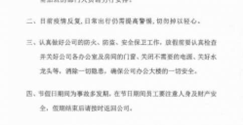 三、節(jié)假日期間為事故多發(fā)期,大家返鄉(xiāng)或出游一定要注意人身及財(cái)產(chǎn)安全,假期結(jié)束后請(qǐng)準(zhǔn)時(shí)返回公司。